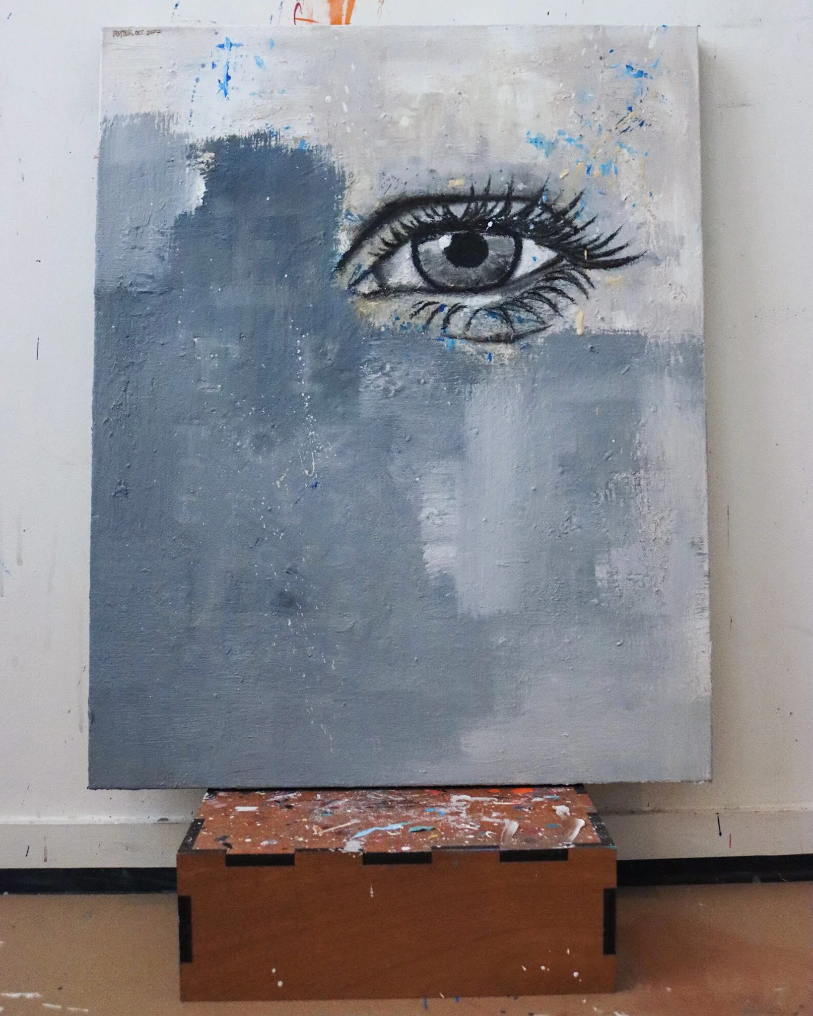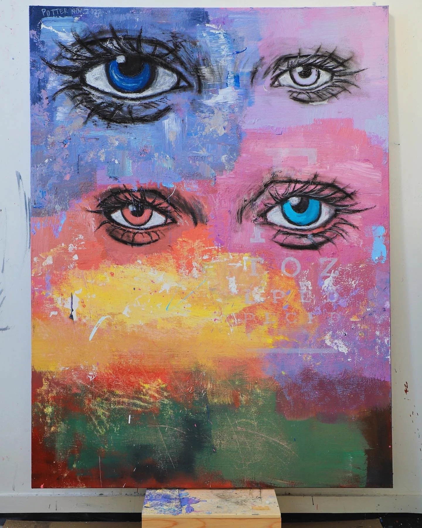 December 2022. Acrylic, graphite, oil pastel, and oil on canvas, 40” x 30”