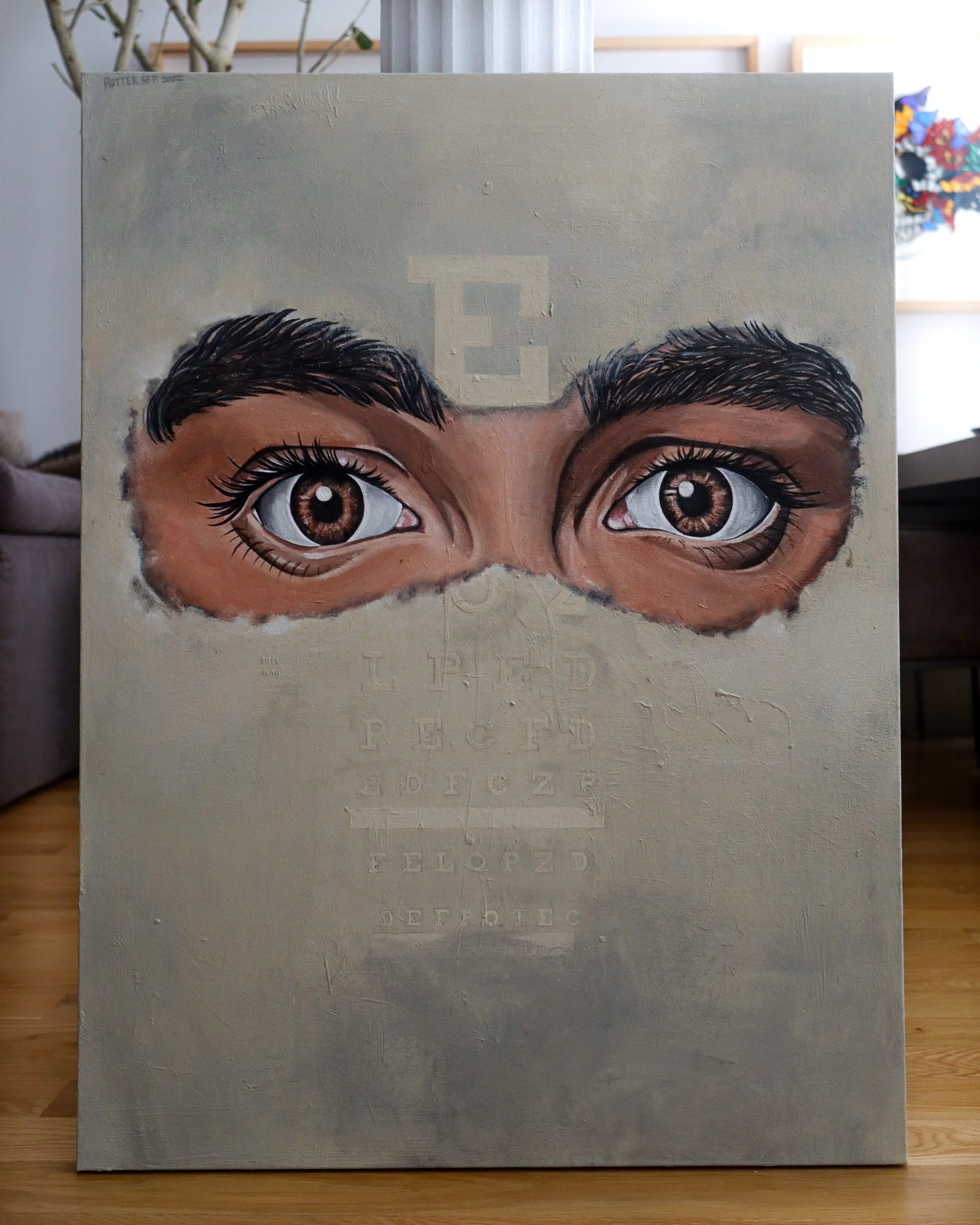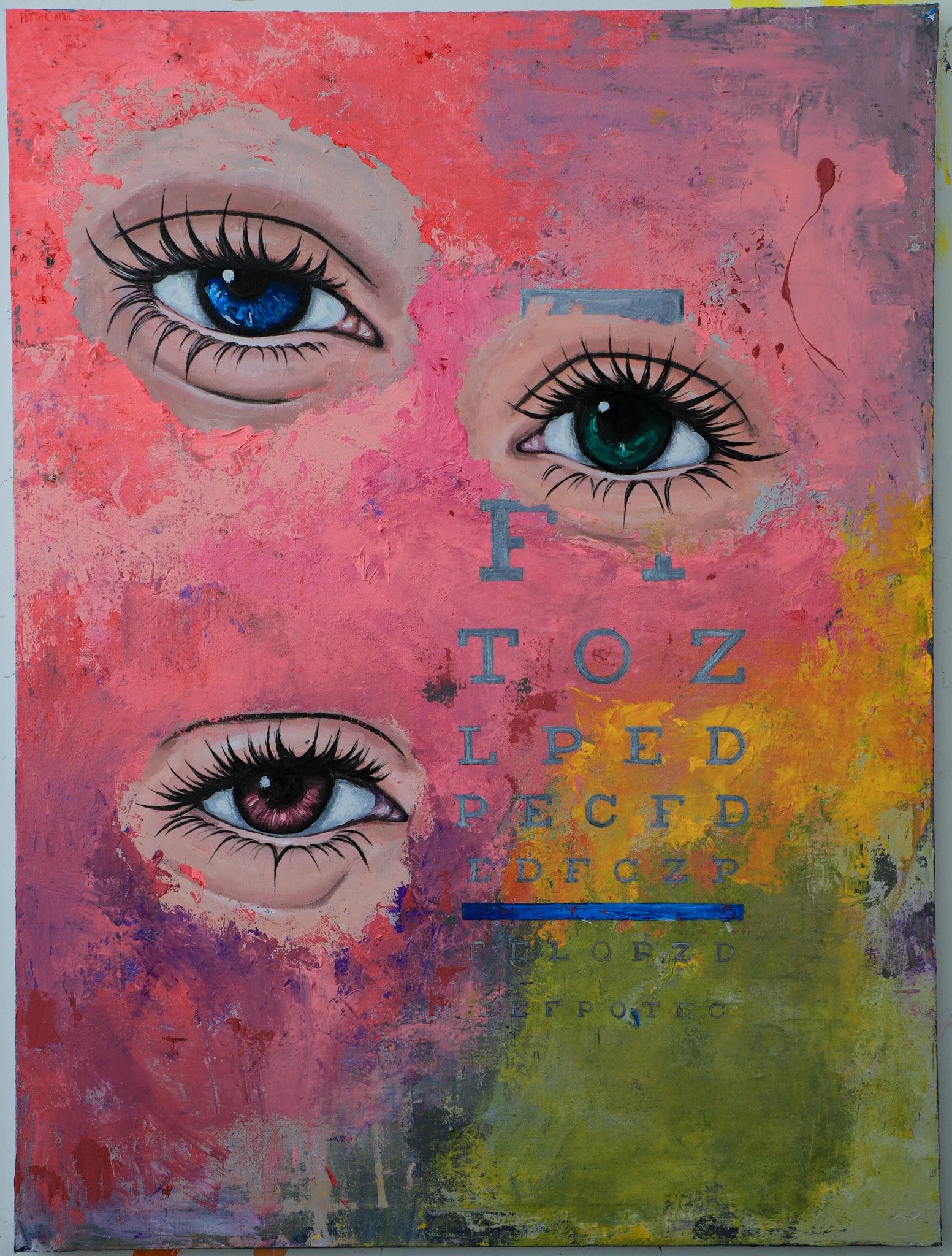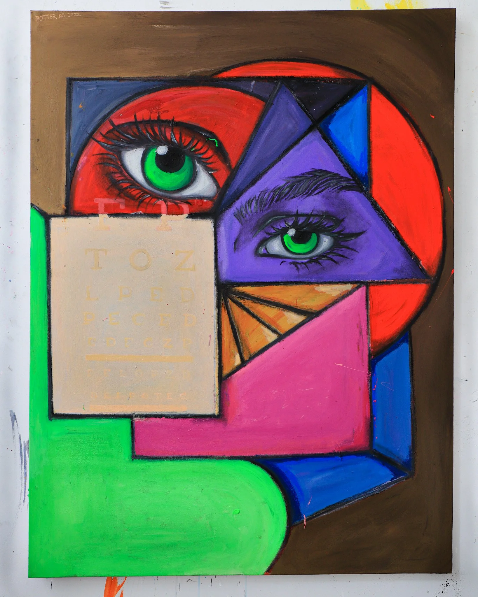February 2022. Acrylic, graphite, colored pencil, and ink on canvas, 30” x 24”