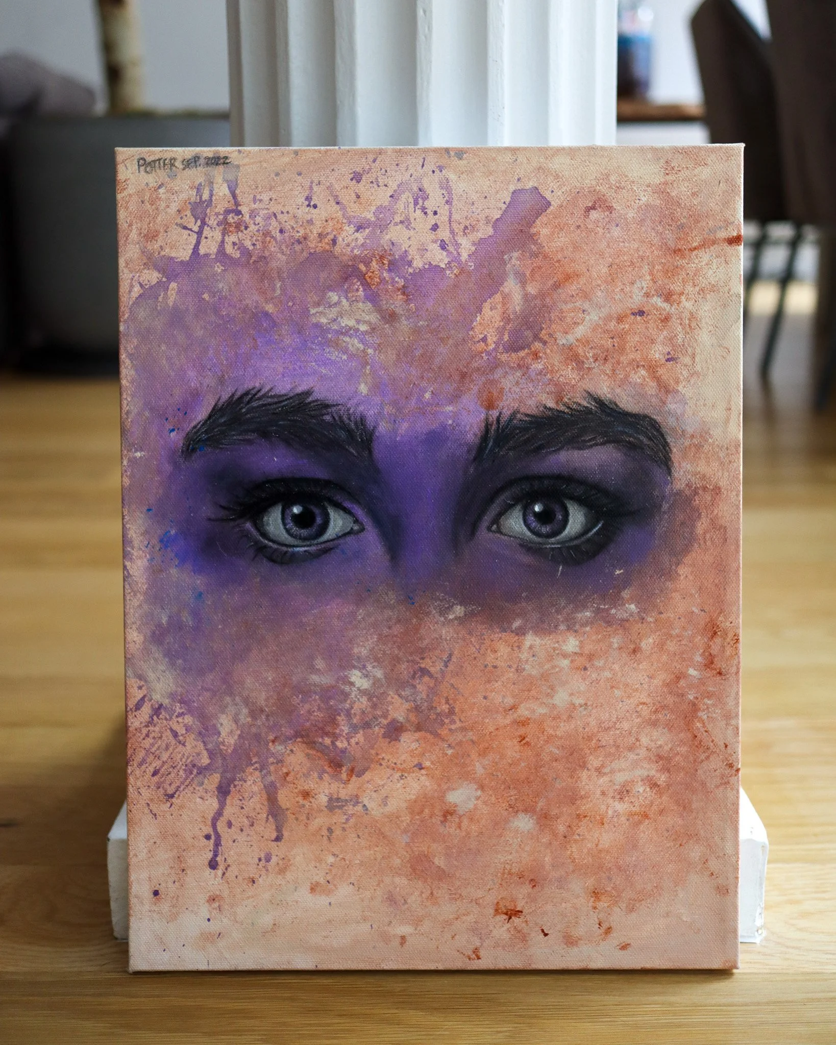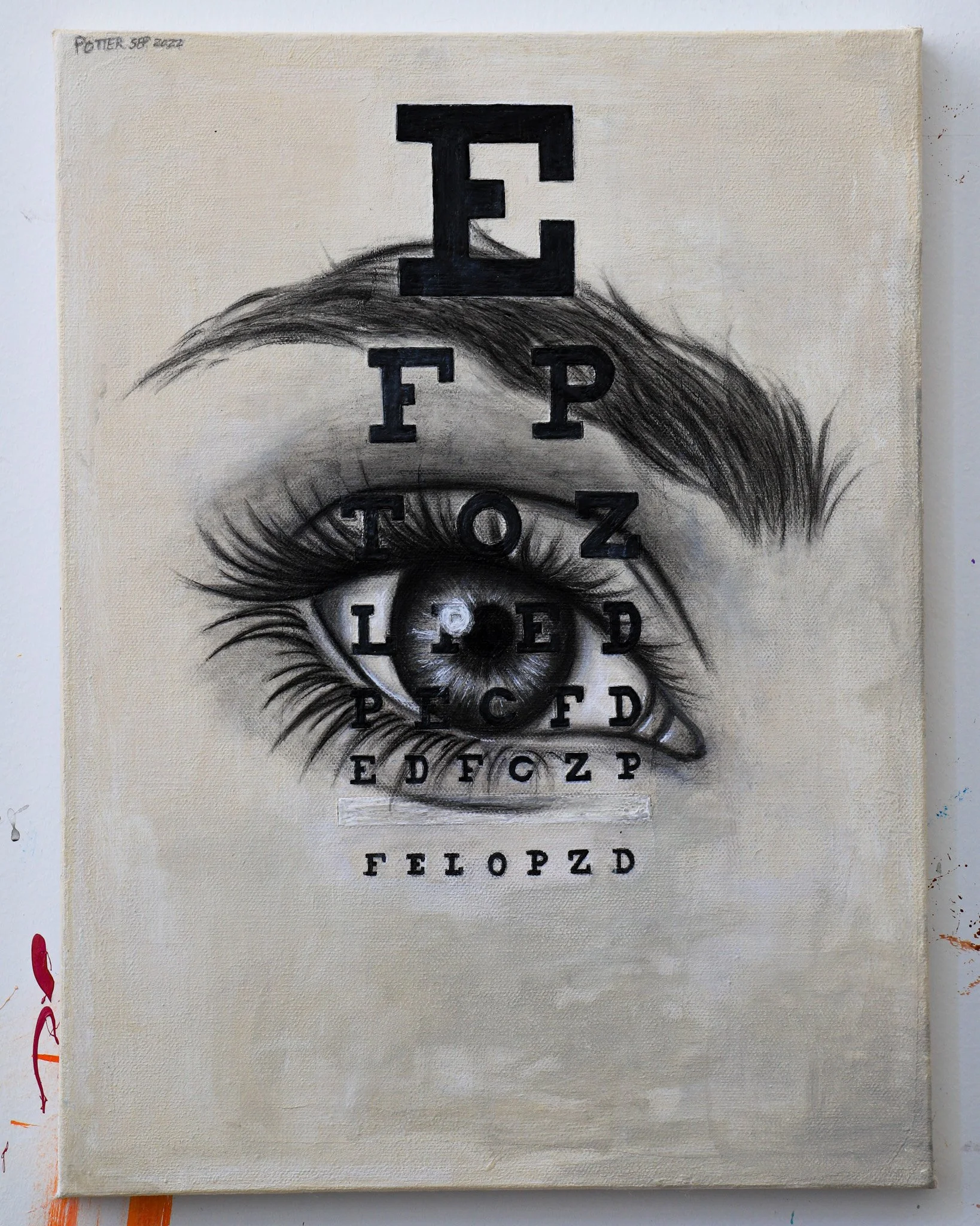 September 2022. Acrylic, graphite, and colored pencil on canvas, 16” x 12”