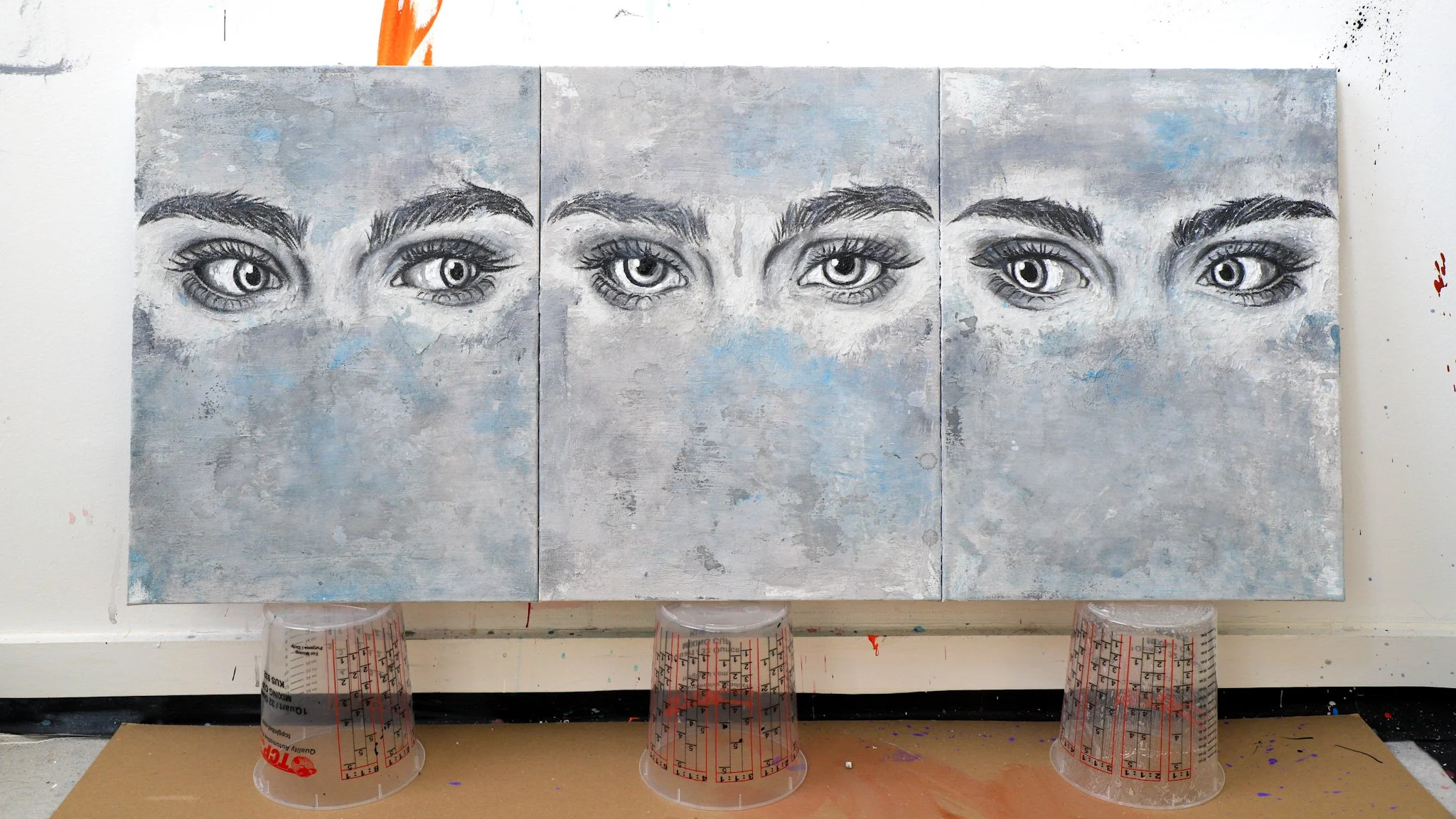 September 2022. Acrylic, graphite, colored pencil, and fiber paste on linen, 16” x 12” (each)