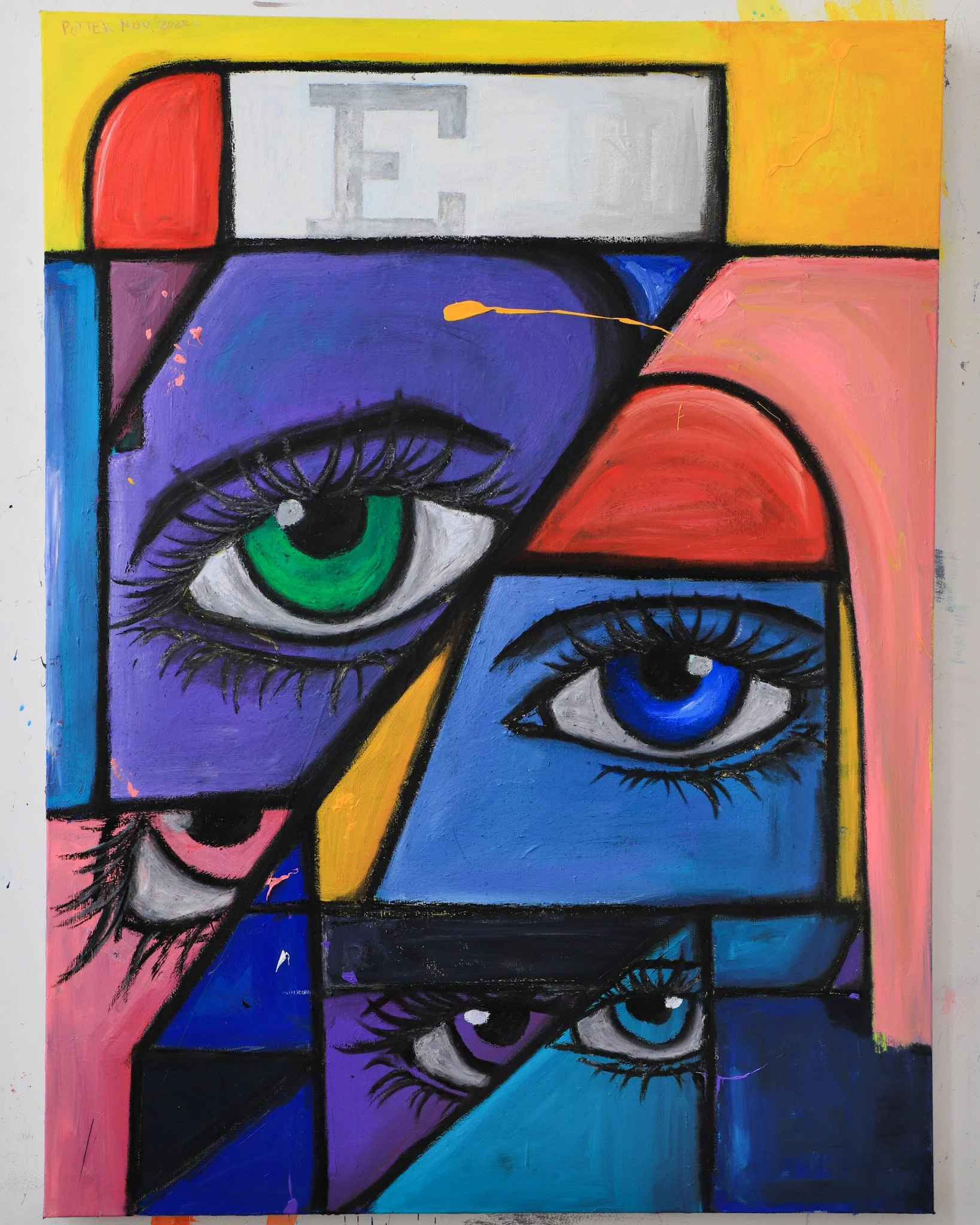 June 2022. Acrylic, graphite, colored pencil, wax crayon, and oil pastel on canvas, 40” x 30”